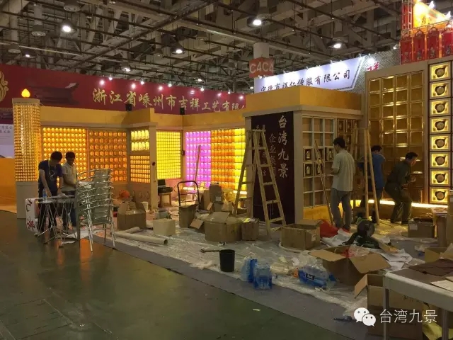 台湾九景集团-厦门泓元七宝光电装饰有限公司 的展位是C4T-013,如图:展会前一天公司员工正在加紧布展